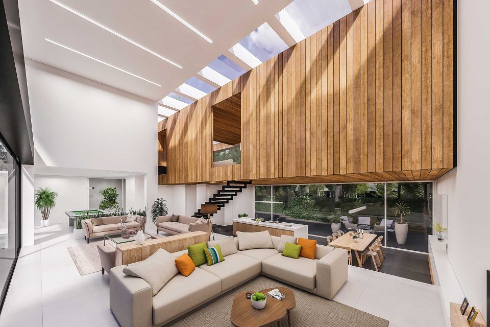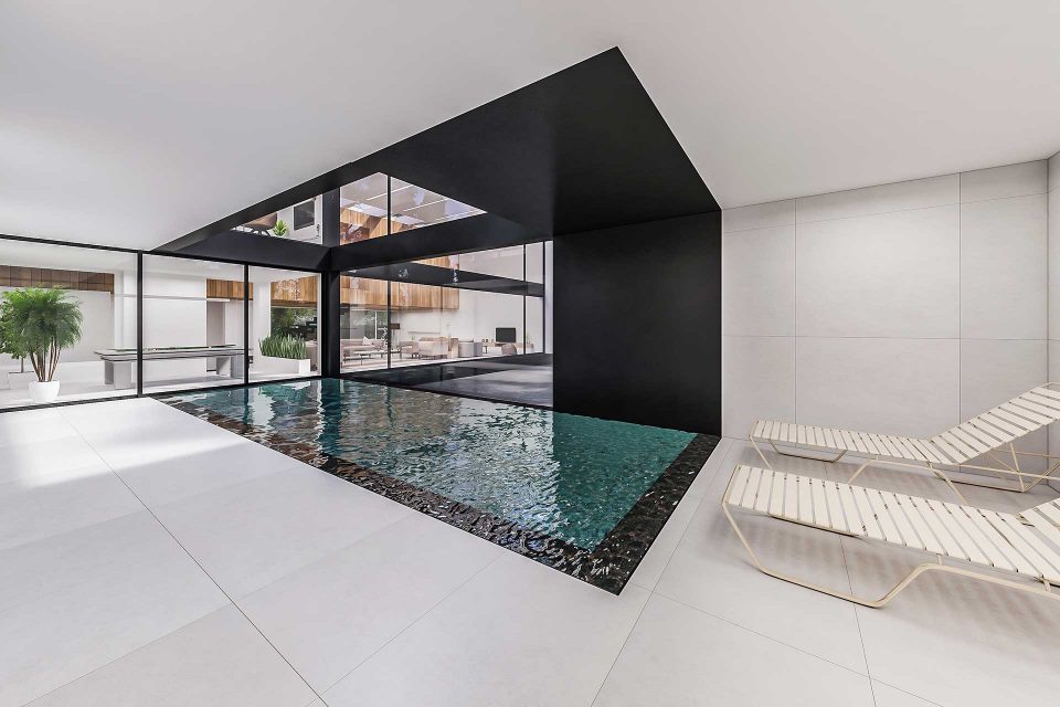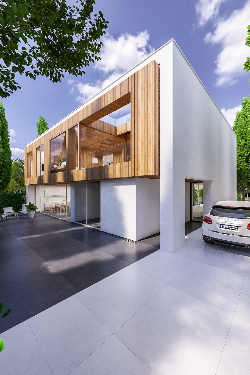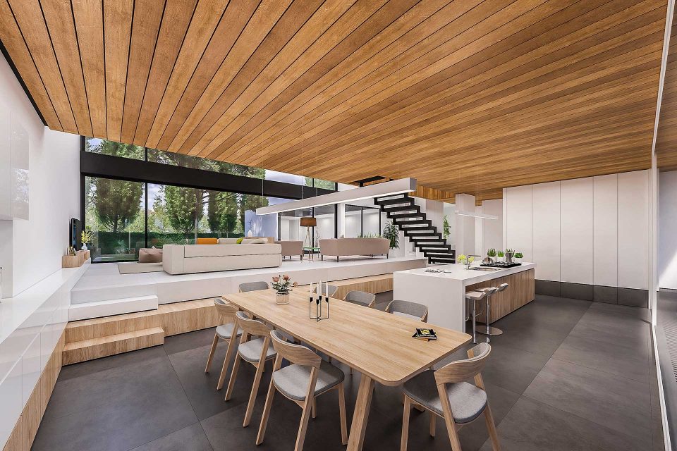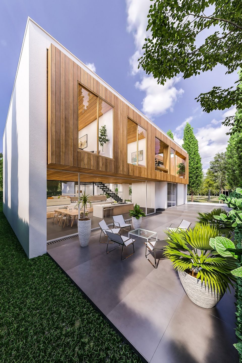 The start of this project was in 2017, this site is located in the Khaneh Darya residential complex, which is a luxury residential suburb in the north of Iran. The client's demands were for a modern, open style, the most space on the ground floor, large windows facing the courtyard, and an acceptable view of the sea. The whole project is defined by the suspended box on the first floor, which has a living room and a terrace with a great view of the sea. To induce a warm feeling, wood is used as the main material. To separate the space between the wooden box and the living room on the ground floor, a gap along the length of the ceiling is used in the form of a continuous skylight. The ground floor is defined as a complete space of 120 sq. And height difference is used to characterize the sense of space. Due to the forbidden rule for having an outdoor pool, our team decided to use the combination of the L-shaped pool alongside a private space with united glass walls on the floor and ceiling. This provides a spacious space with privacy that allows one to use the pool all through the year with natural sunlight.