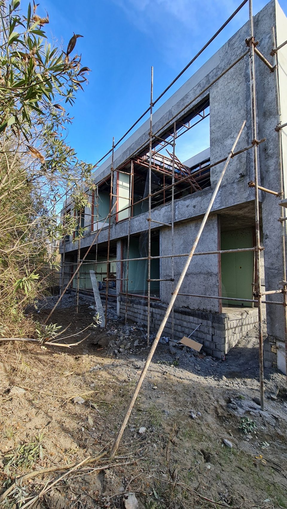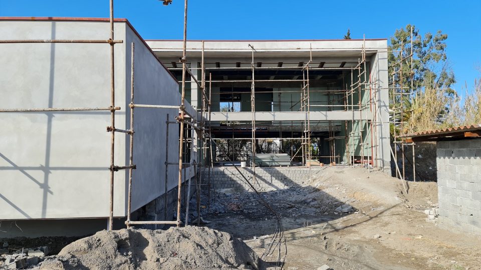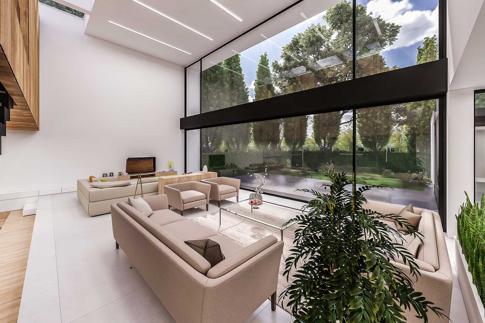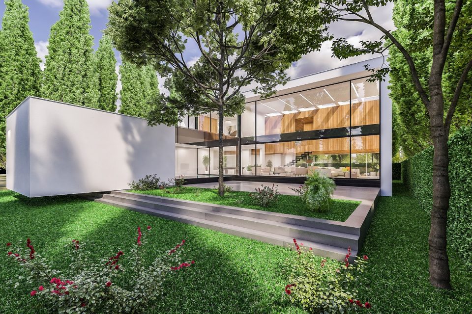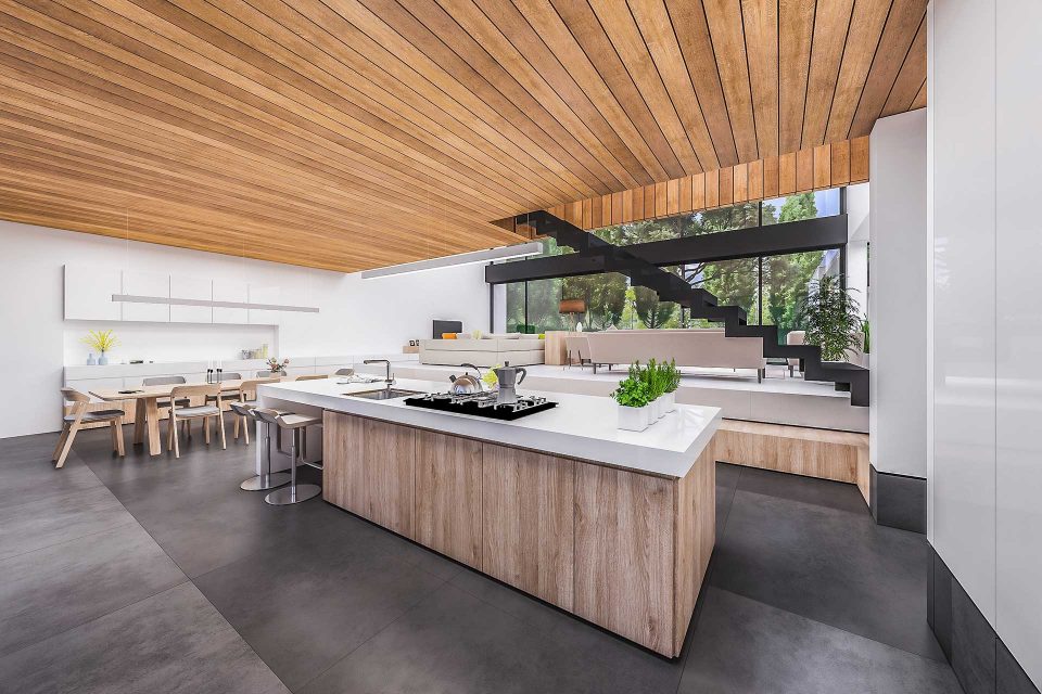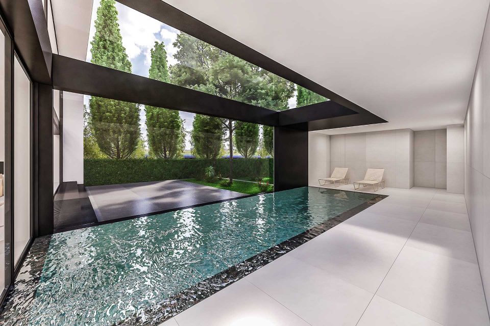 The start of this project was in 2017, this site is located in the Khaneh Darya residential complex, which is a luxury residential suburb in the north of Iran. The client's demands were for a modern, open style, the most space on the ground floor, large windows facing the courtyard, and an acceptable view of the sea. The whole project is defined by the suspended box on the first floor, which has a living room and a terrace with a great view of the sea. To induce a warm feeling, wood is used as the main material. To separate the space between the wooden box and the living room on the ground floor, a gap along the length of the ceiling is used in the form of a continuous skylight. The ground floor is defined as a complete space of 120 sq. And height difference is used to characterize the sense of space. Due to the forbidden rule for having an outdoor pool, our team decided to use the combination of the L-shaped pool alongside a private space with united glass walls on the floor and ceiling. This provides a spacious space with privacy that allows one to use the pool all through the year with natural sunlight.