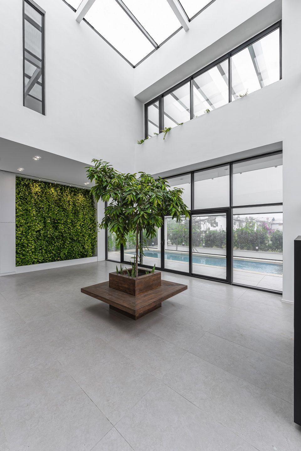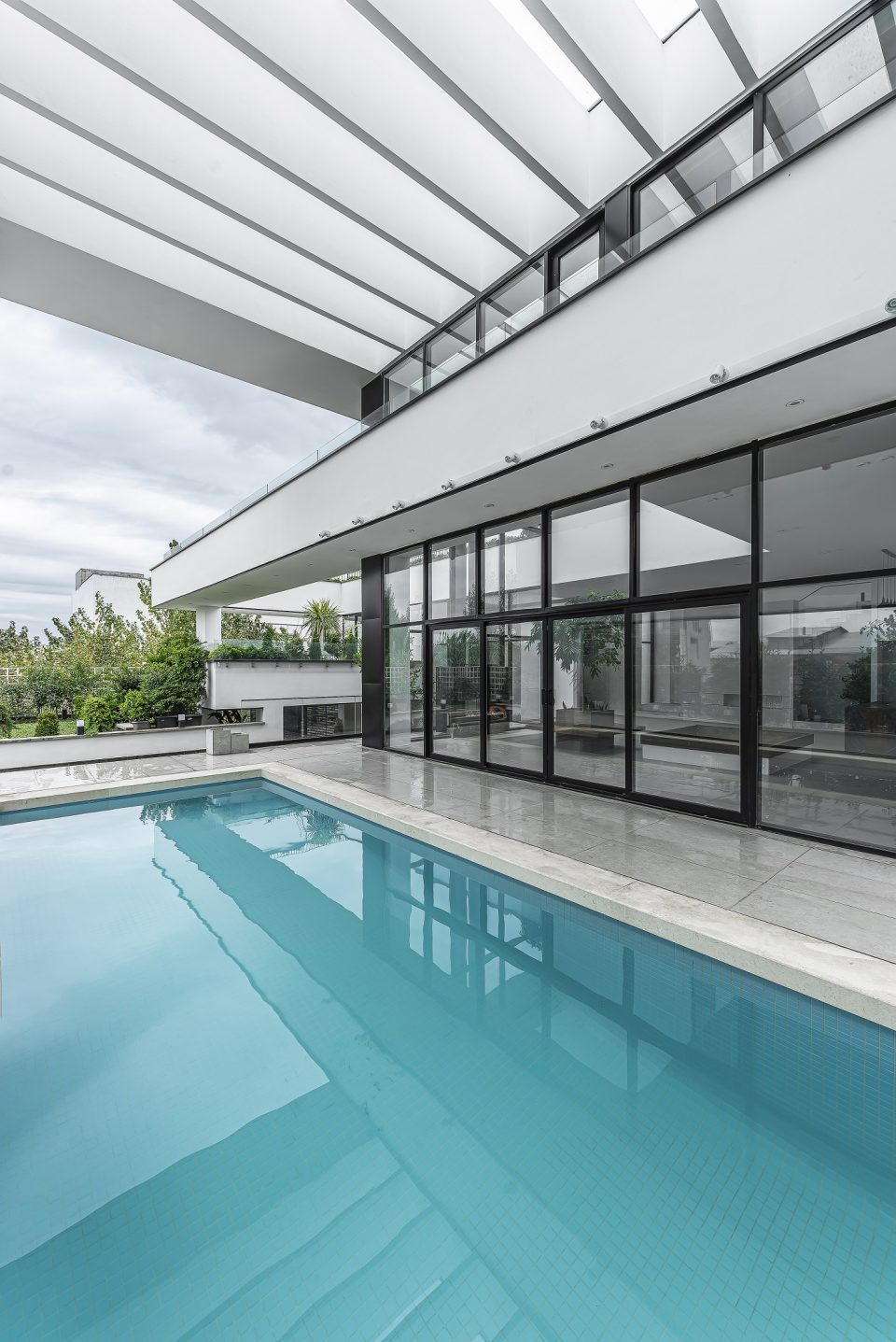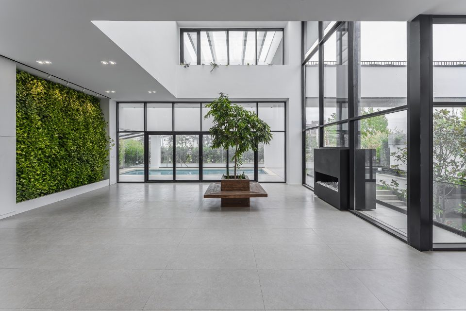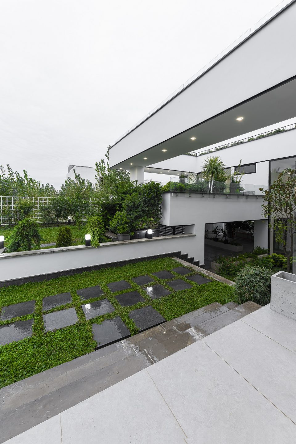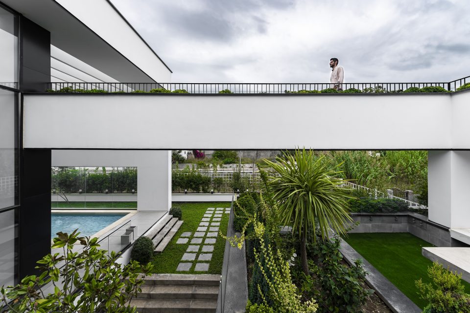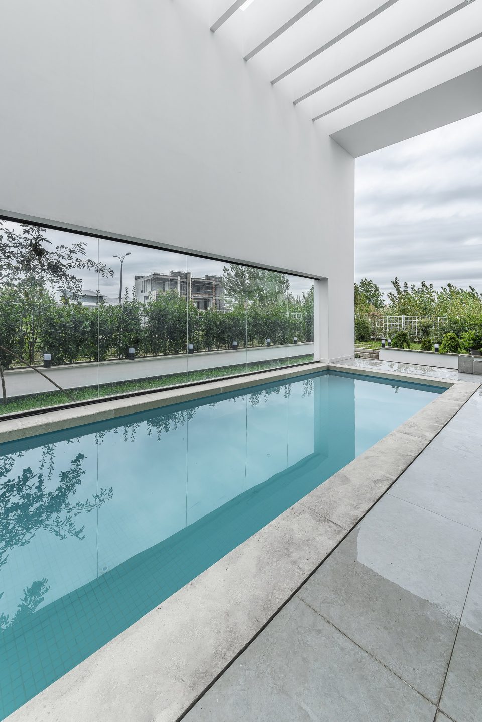This villa started in 2017 and lasted for 24 months. The concept of this project was based on the maximum use of external and internal green space. In this regard, as the first stage, the split-level floor plan is designed with an external solid facade. The inside space is somehow multi-dimensional, all spaces are connected to each other, especially to the courtyard. Master bedrooms have access to the roof garden. Moreover, the covered pool has access to a garden and skylight to have ventilation and natural light. A shallow transparent water pond is located on the roof garden. Furthermore, it can be said that the pond was built over the main staircase ceiling. So, if you look up at the ceiling or going up stairs on a sunny day, you will amaze by the refraction of the water.