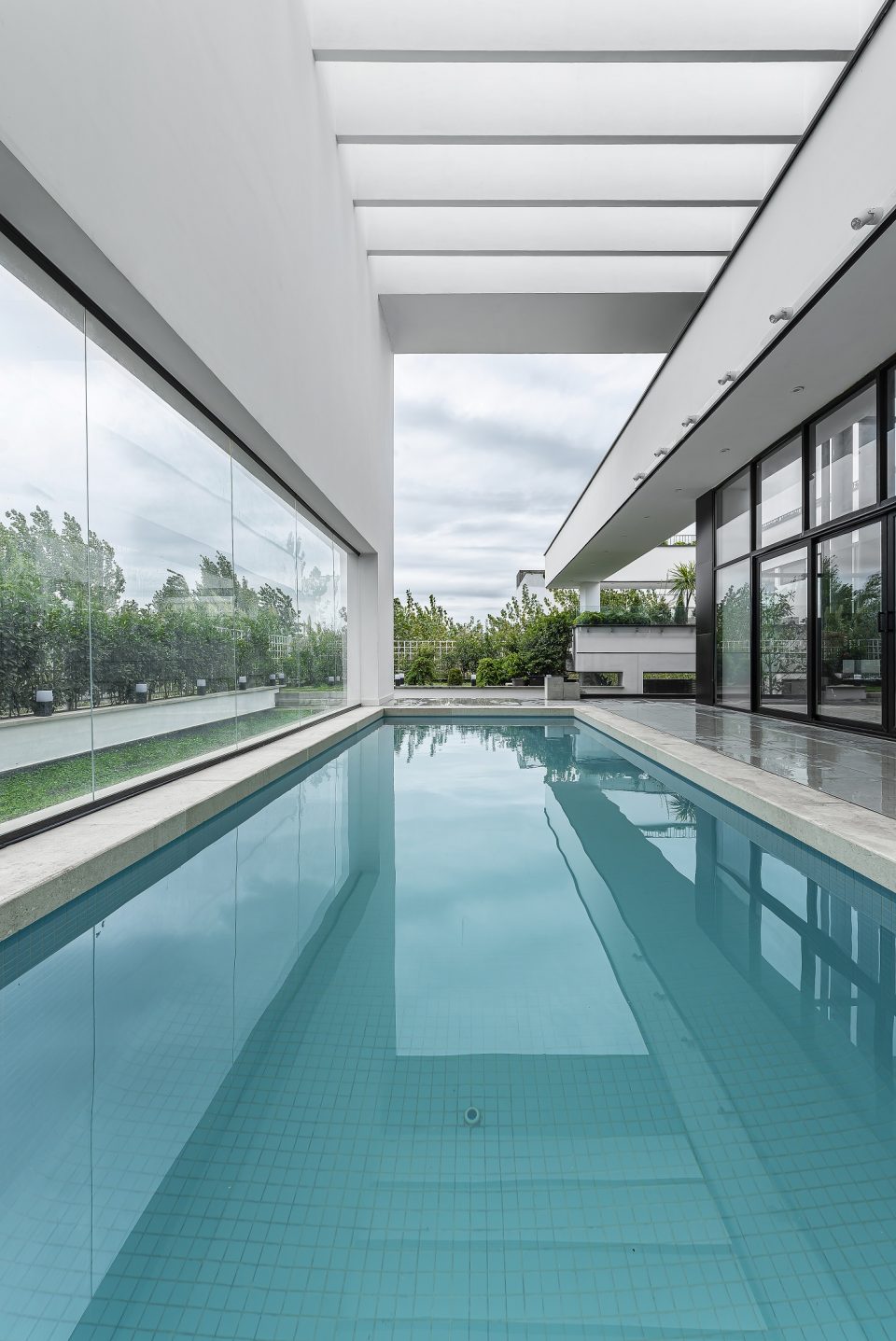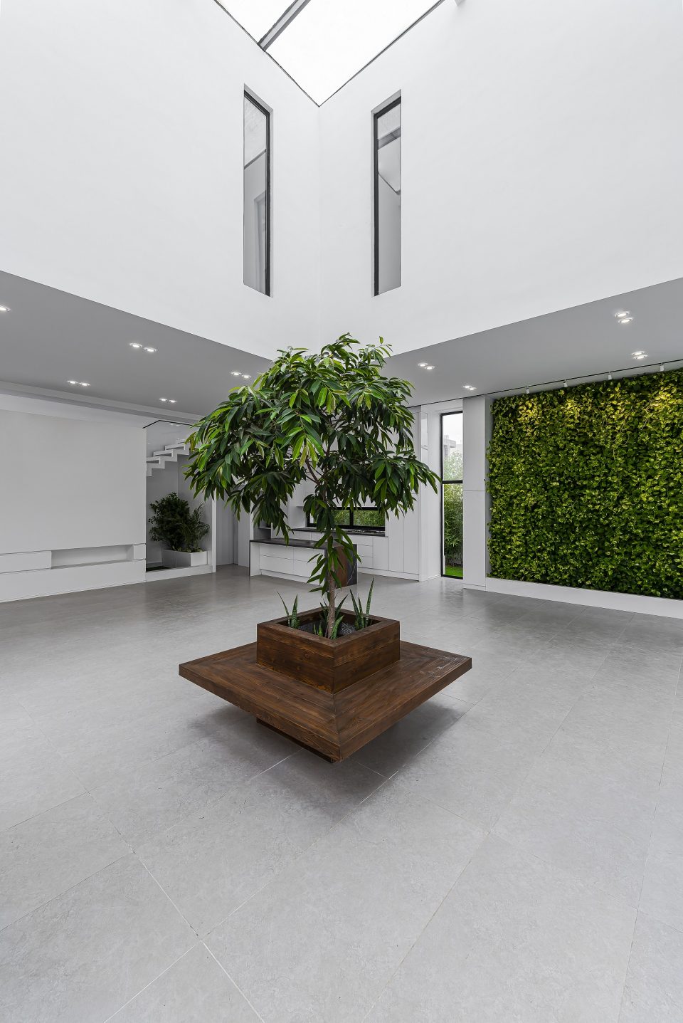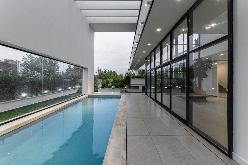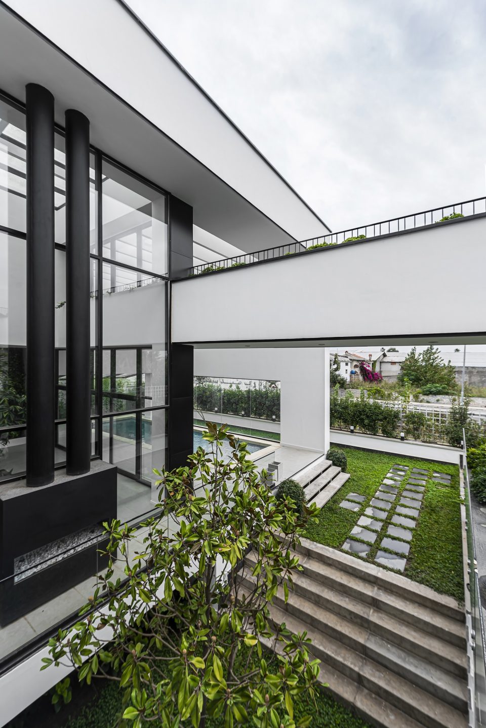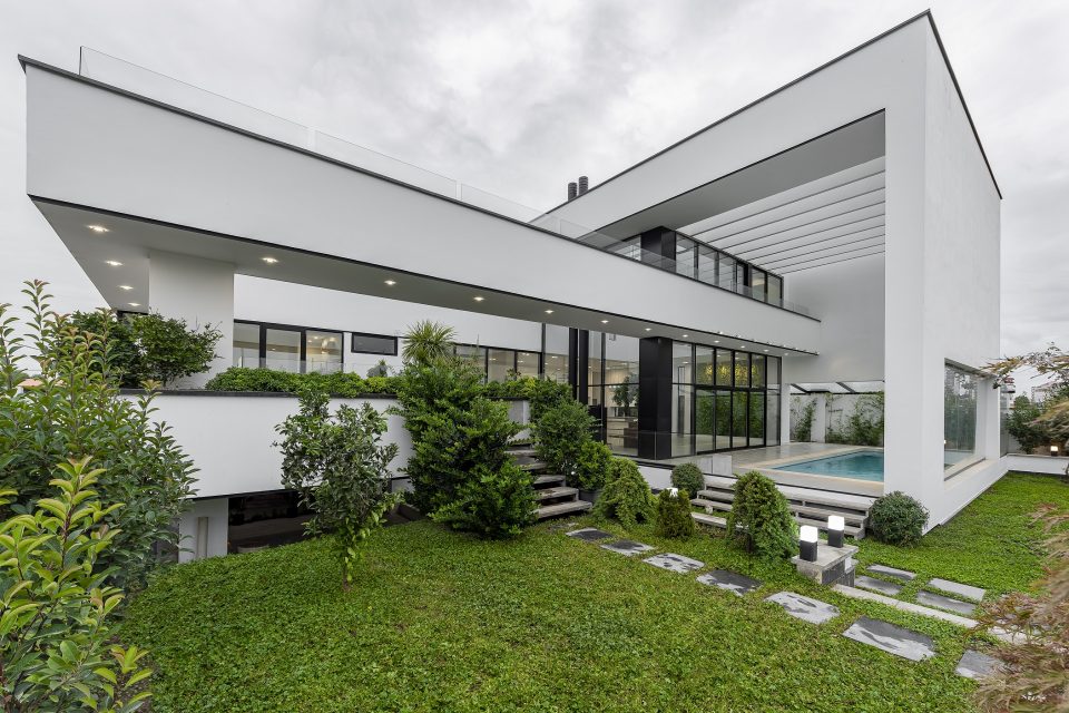 This villa started in 2017 and lasted for 24 months. The concept of this project was based on the maximum use of external and internal green space. In this regard, as the first stage, the split-level floor plan is designed with an external solid facade. The inside space is somehow multi-dimensional, all spaces are connected to each other, especially to the courtyard. Master bedrooms have access to the roof garden. Moreover, the covered pool has access to a garden and skylight to have ventilation and natural light. A shallow transparent water pond is located on the roof garden. Furthermore, it can be said that the pond was built over the main staircase ceiling. So, if you look up at the ceiling or going up stairs on a sunny day, you will amaze by the refraction of the water.