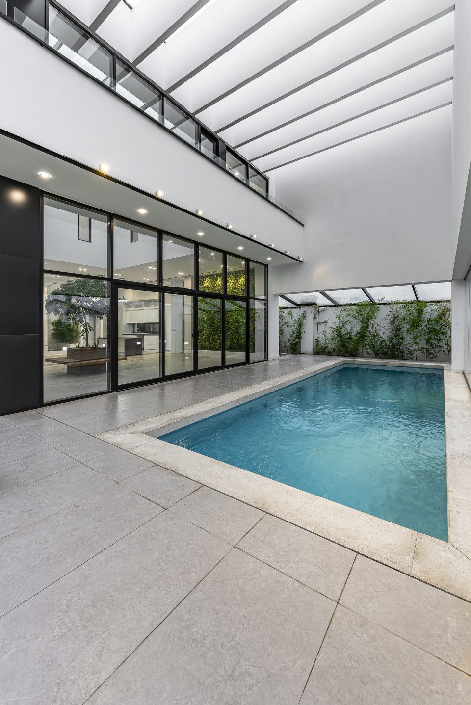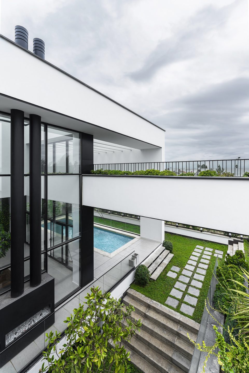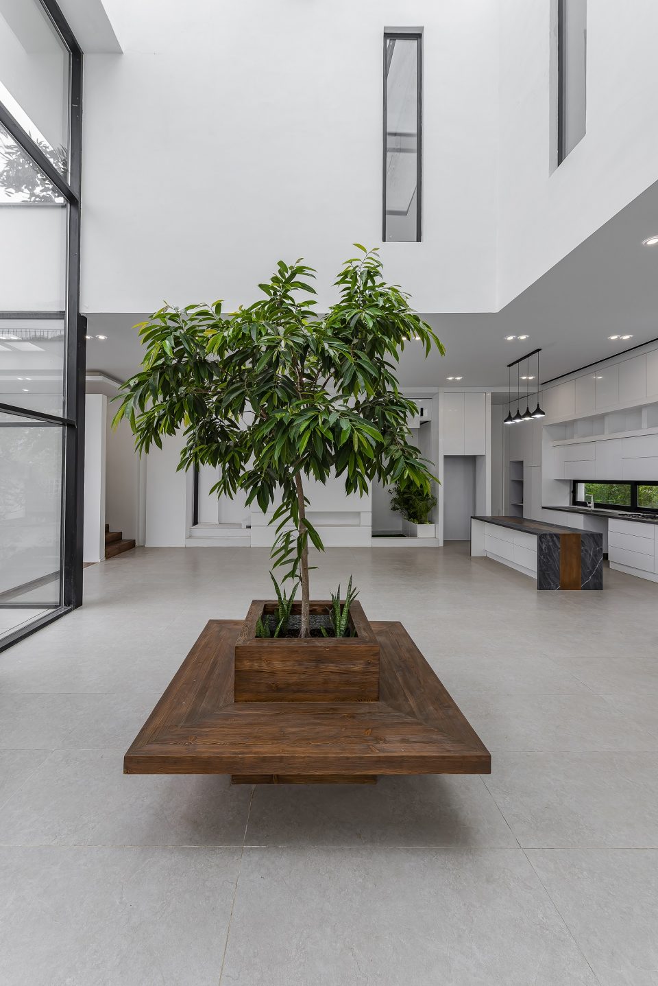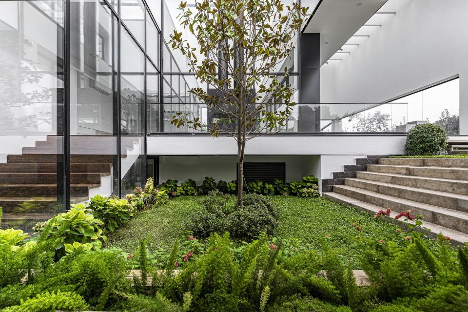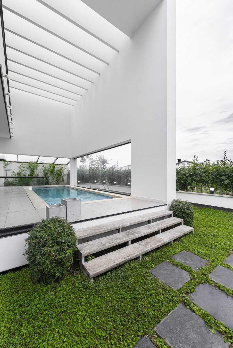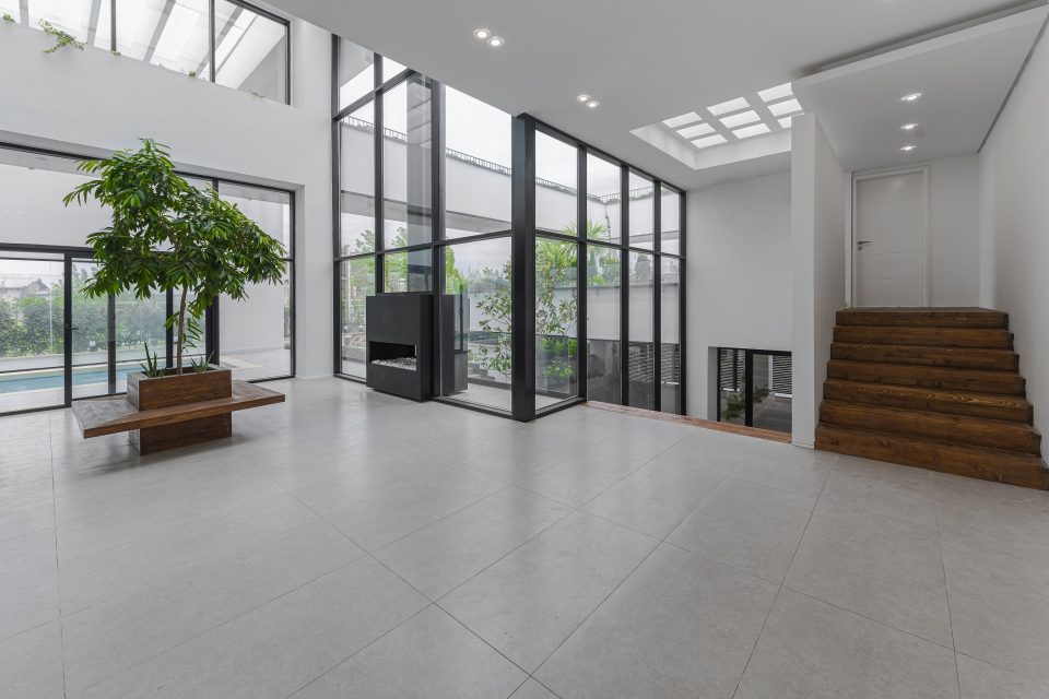 This villa started in 2017 and lasted for 24 months. The concept of this project was based on the maximum use of external and internal green space. In this regard, as the first stage, the split-level floor plan is designed with an external solid facade. The inside space is somehow multi-dimensional, all spaces are connected to each other, especially to the courtyard. Master bedrooms have access to the roof garden. Moreover, the covered pool has access to a garden and skylight to have ventilation and natural light. A shallow transparent water pond is located on the roof garden. Furthermore, it can be said that the pond was built over the main staircase ceiling. So, if you look up at the ceiling or going up stairs on a sunny day, you will amaze by the refraction of the water.